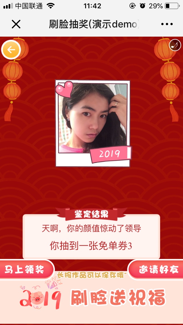 3、最終選擇開始刷(shua)臉,合(he)成(cheng)一張(zhang)刷(shua)臉照片進行抽(chou)獎(jiang);可以抽(chou)紅包和(he)實物,抽(chou)中紅包直接發紅包,抽(chou)中實物需(xu)要填寫姓(xing)名和(he)電話(hua)進行(xing)領取獎品;