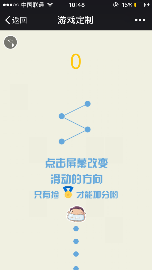 2、初始狀態下,獎章為0個(玩家每收集成功1個獎章則獎章數加1,撞到障礙物則游戲結束)