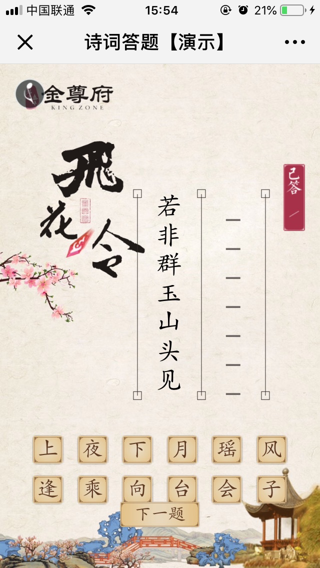 【游戲說明】飛花令,隨機抽取題目,帶有排行榜,分享增加次數。適合節日民俗文化推廣,品牌植入。