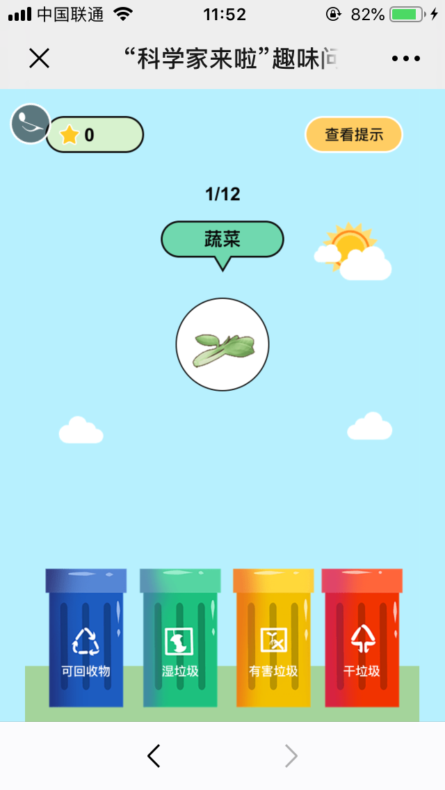 2、垃圾分類對了可以加分,分類錯誤,出現提示說明
