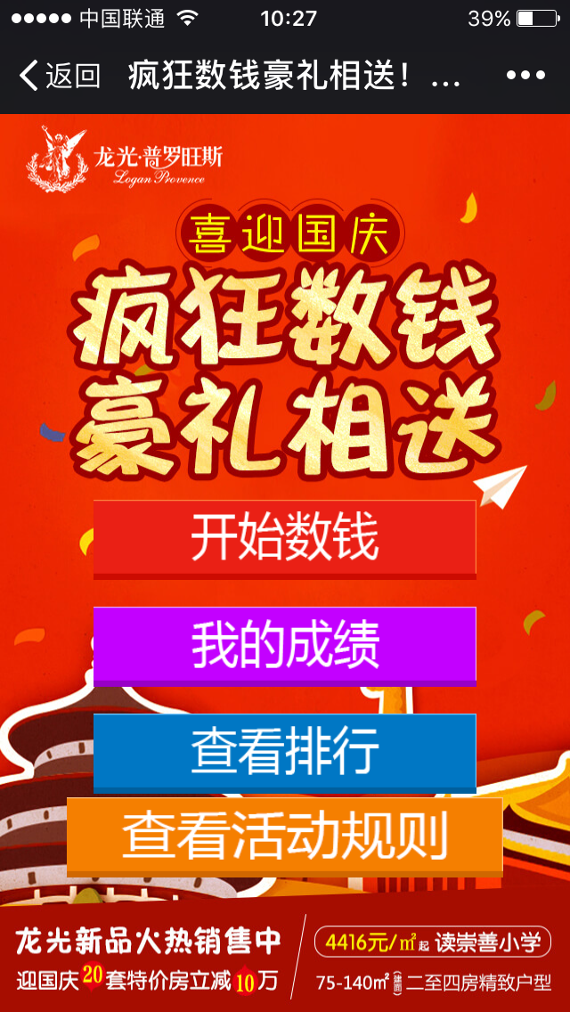 【游戲說明】月末獎金、年末獎金、春節壓歲錢,誰不想數錢數到手抽筋。微信游戲迎合用戶的心理,將數錢游戲與商家品牌結合,在游戲中記住了品牌價值,真正一款花小錢,擴大朋友圈粉絲推廣的小游戲。