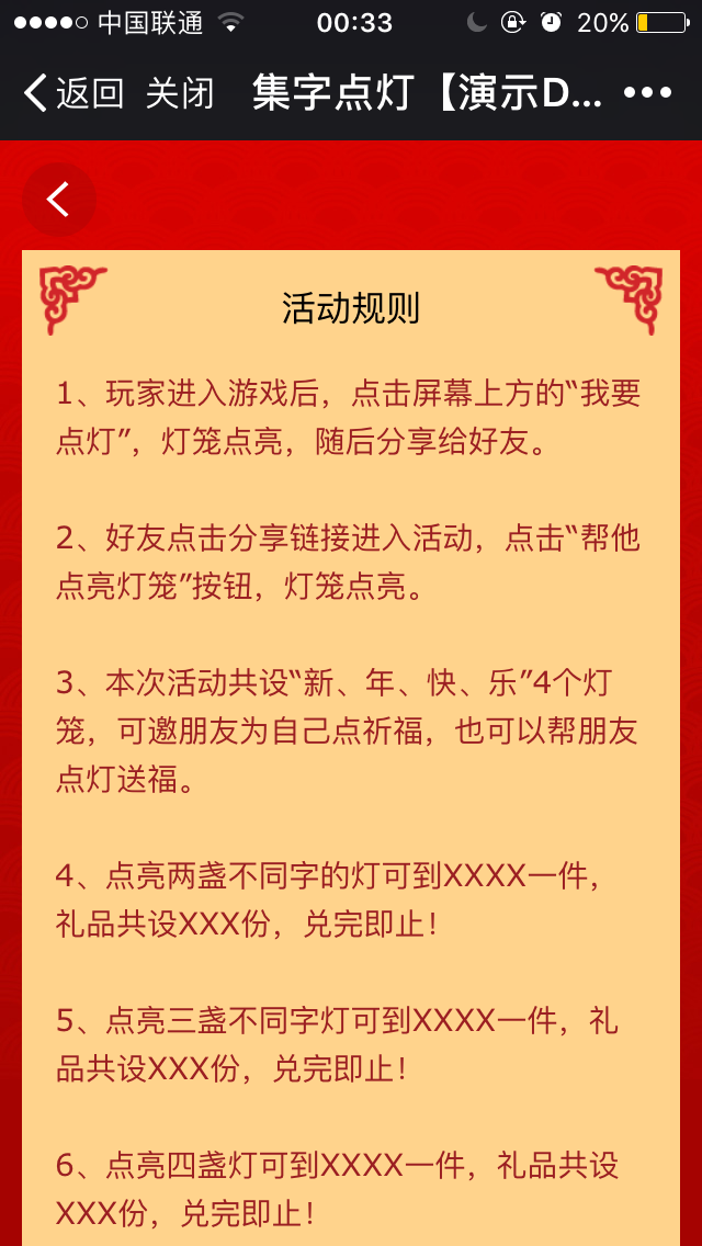 【游戲說明】新年紅紅火火的界面,助力點燈集人氣,設置“新、年、快、樂”4個燈籠,點亮幾盞不同字的燈可得到不同的禮品。