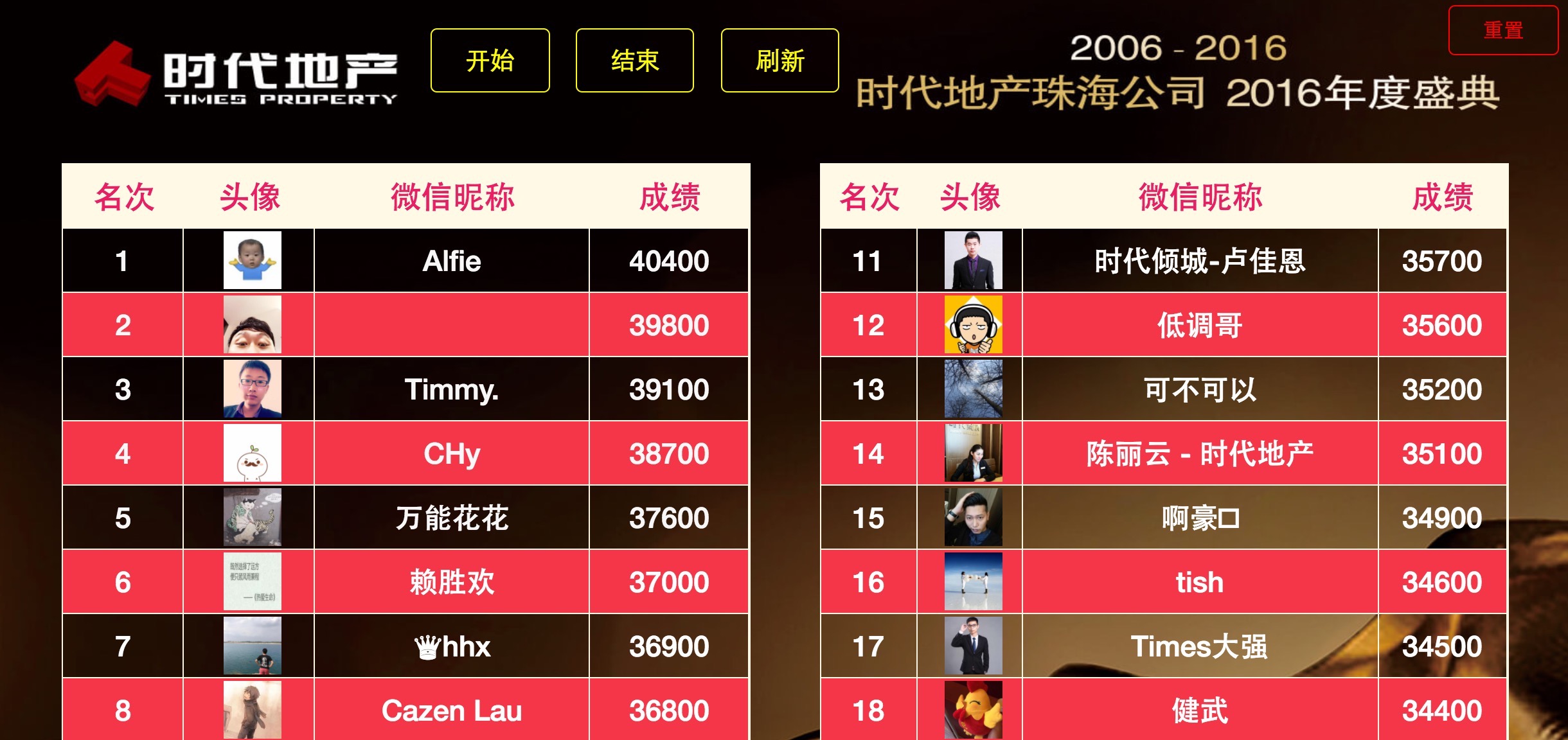 2、現場大屏幕顯示前xx名的用戶信息和比分;
