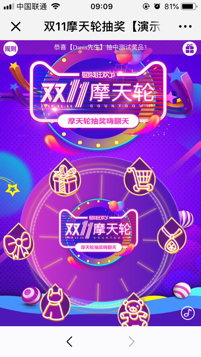 1、活動期間,點擊摩天輪上的禮品圖,抽取獎品;