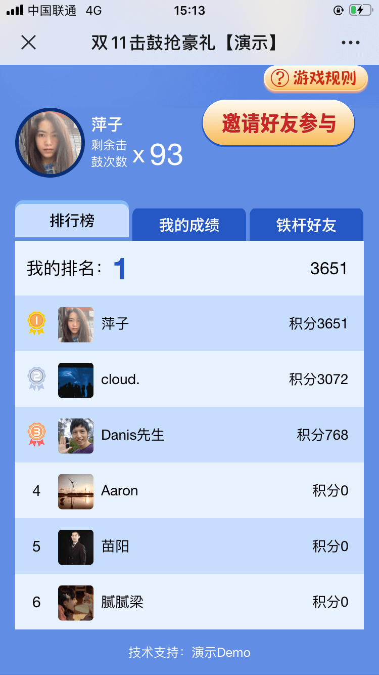 進入游戲——填寫信息——自己有x次擊鼓機會——分享好友增加x次——查看排行榜和活動規則