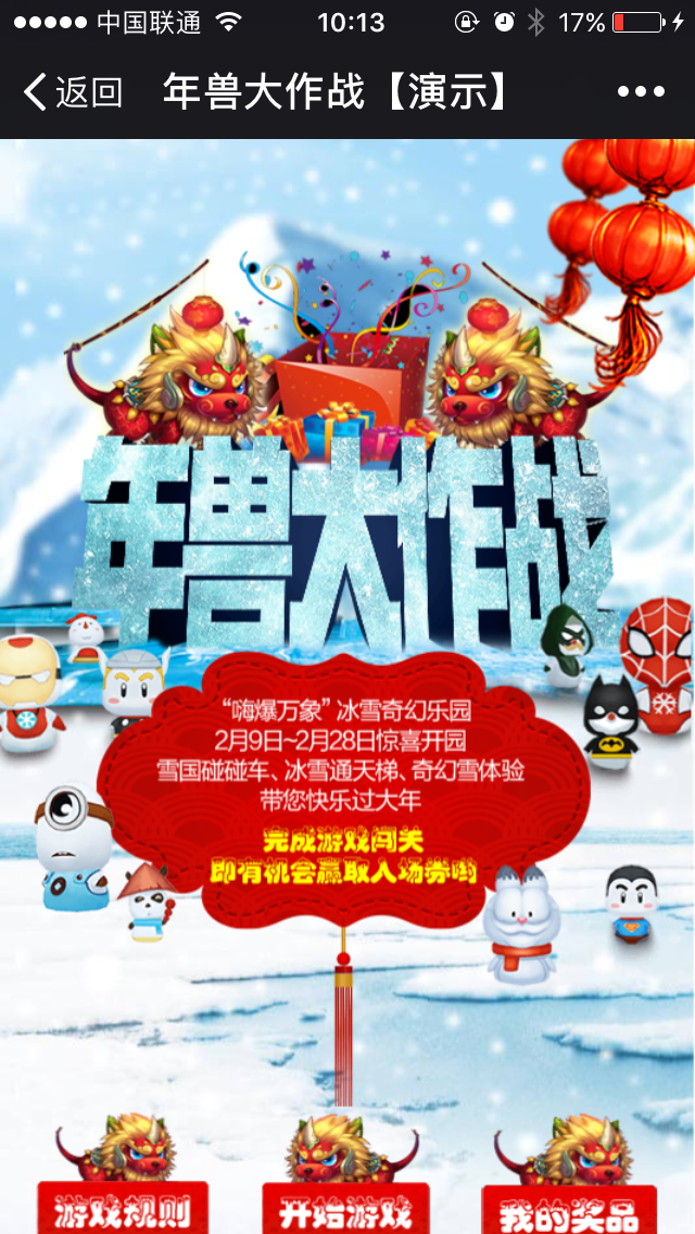 【游戲說明】彈弓攻擊年獸軍團,打中可加分,冰凍降低其攻擊力。闖關成功,有抽獎機會,兌換獎品,可線上線下結合。