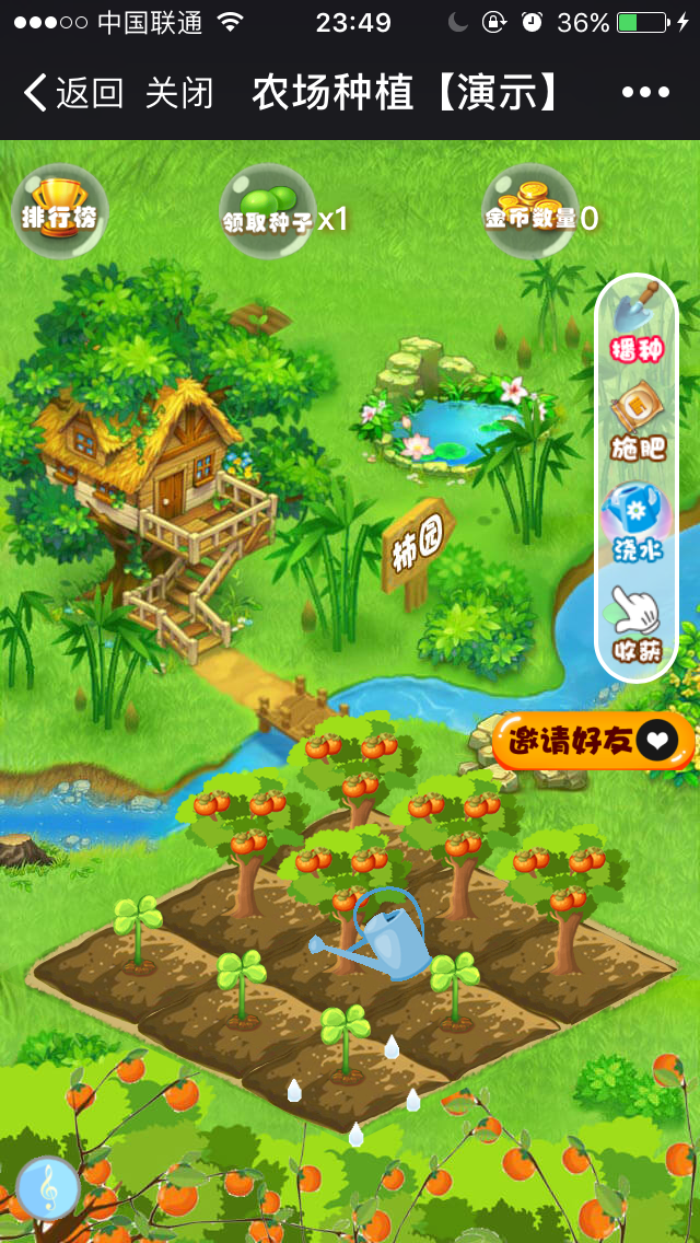 1、點擊右側的工具進行土地播種、施肥、澆水、收獲柿園果實