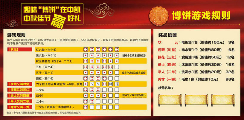 中(zhong)秋(qiu)(qiu)將至,在福建廈門流行一種博餅游(you)戲。通(tong)過扔(reng)骰子得到的(de)點數,來獲(huo)取(qu)相應的(de)獎(jiang)品,這已(yi)(yi)經成為了(le)廈門地(di)區(qu)幾(ji)乎每家每戶中(zhong)秋(qiu)(qiu)佳節(jie)必玩(wan)的(de)一個游(you)戲了(le)。(游(you)戲規則如(ru)下圖)近年(nian)來,博餅已(yi)(yi)經成了(le)很多(duo)商(shang)家在聚集人(ren)氣,營銷產品的(de)一大利器。比如(ru)買一件(jian)商(shang)品,累(lei)計多(duo)少費(fei)用,可(ke)以(yi)參與商(shang)場的(de)博餅游(you)戲,贏取(qu)大禮。